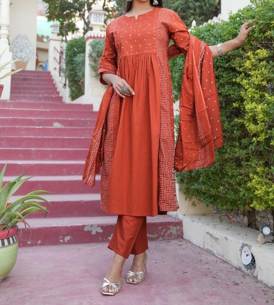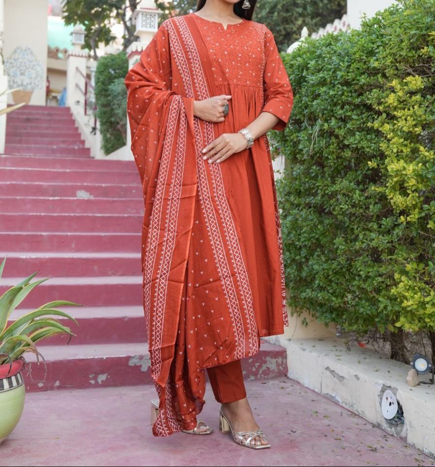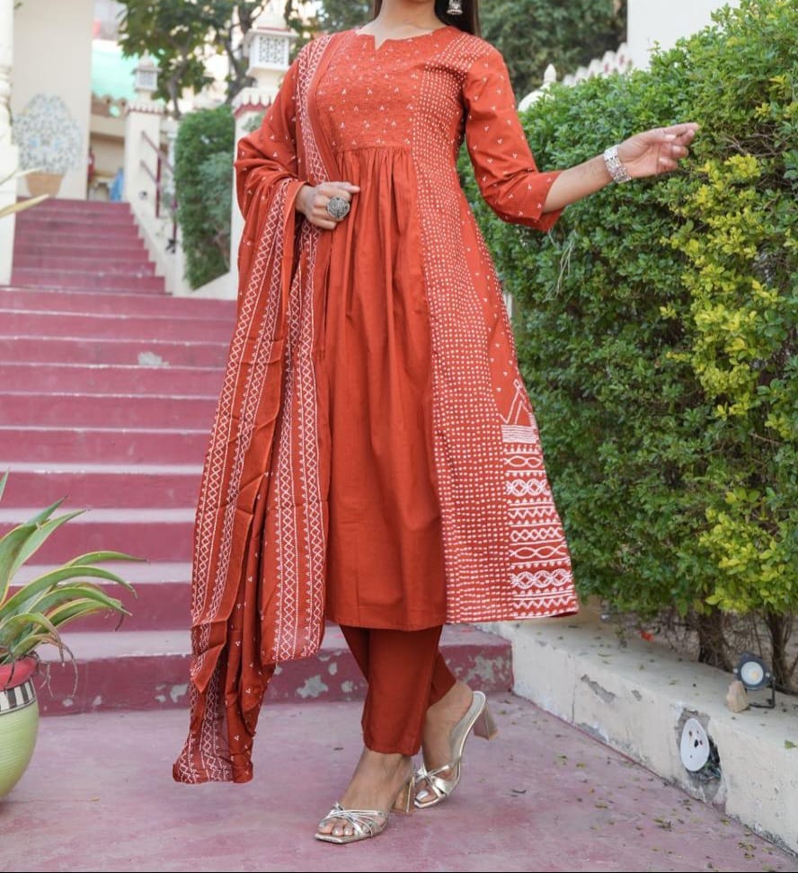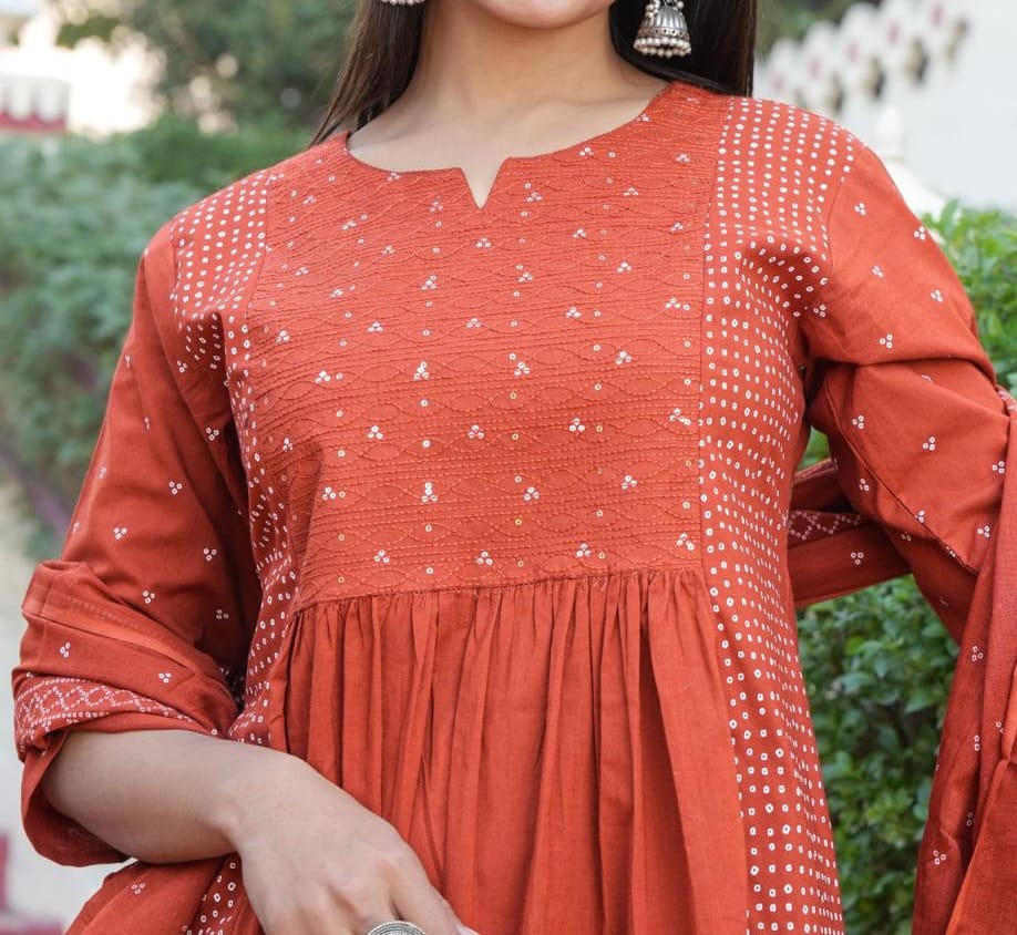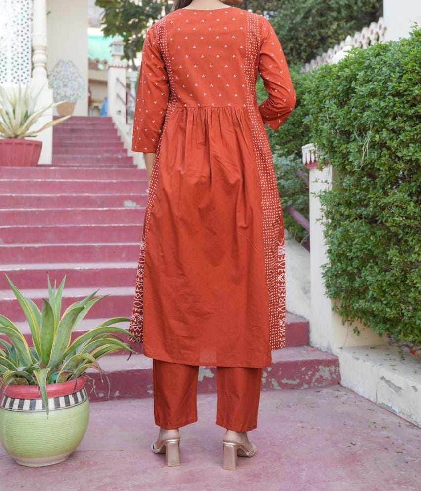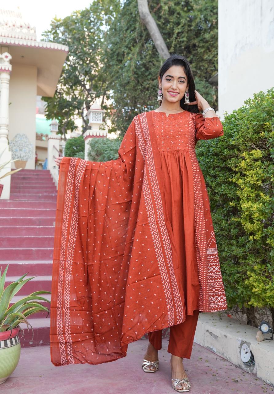 Rust Cotton Long Kurta with Mirror Work and Flared Design