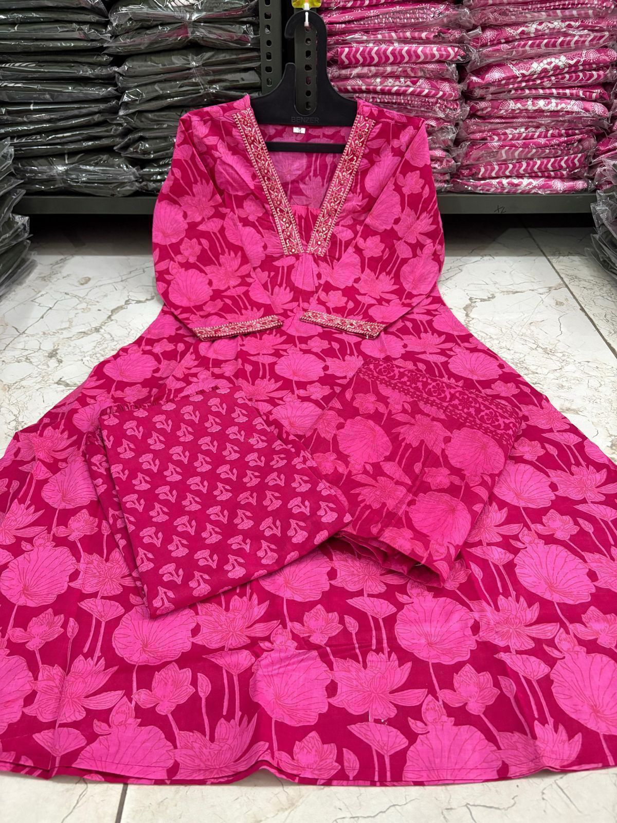 Full  anarkali 3pcs Pure cotton 60.60 Set . Kurti with neck embroidery work with pant and dupatta