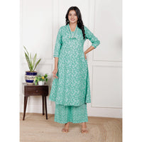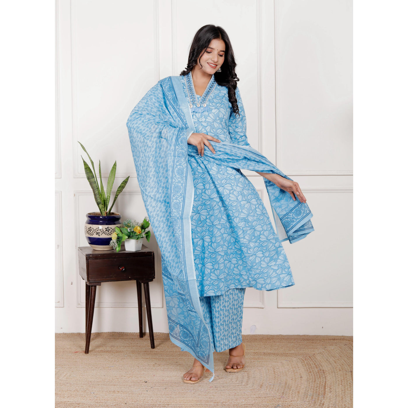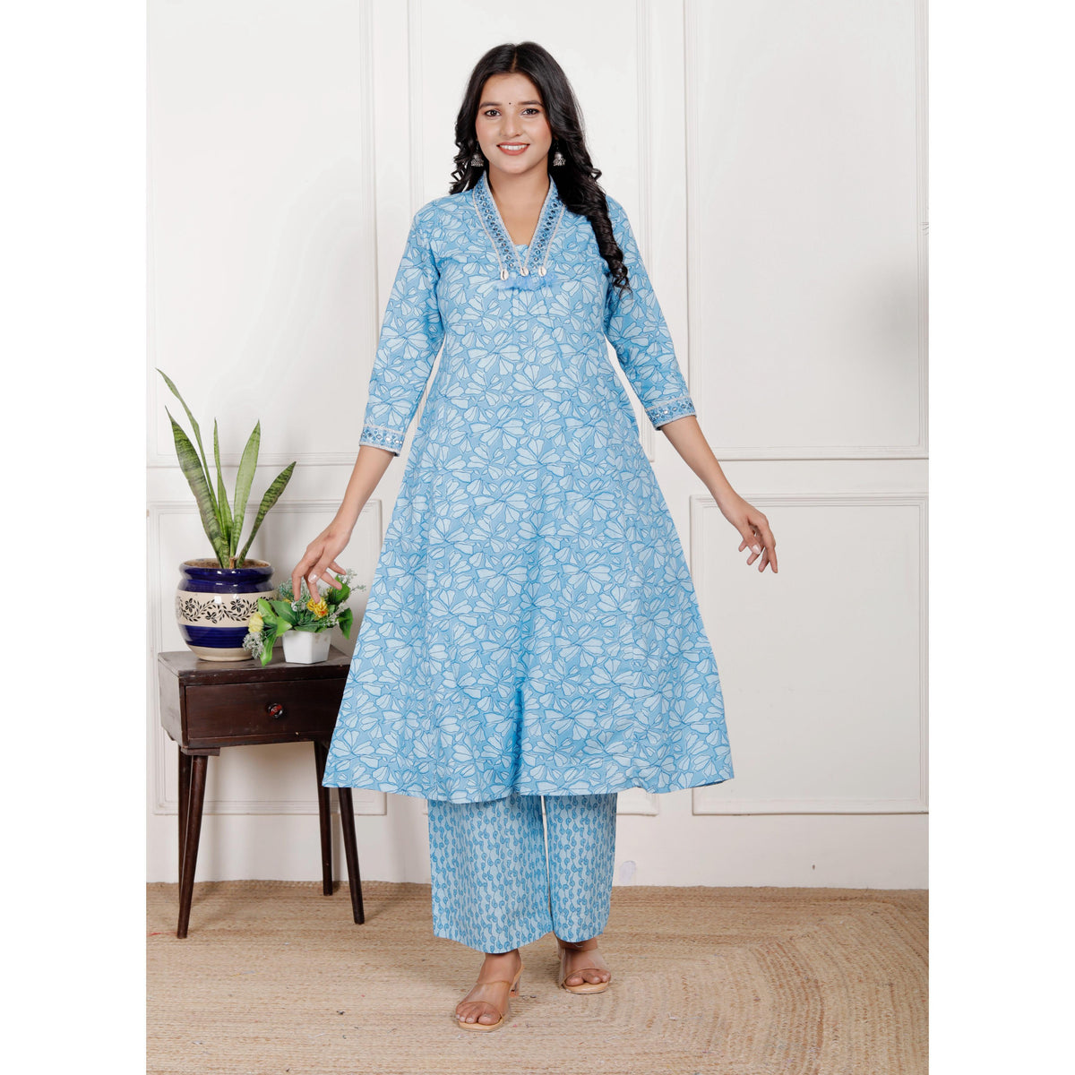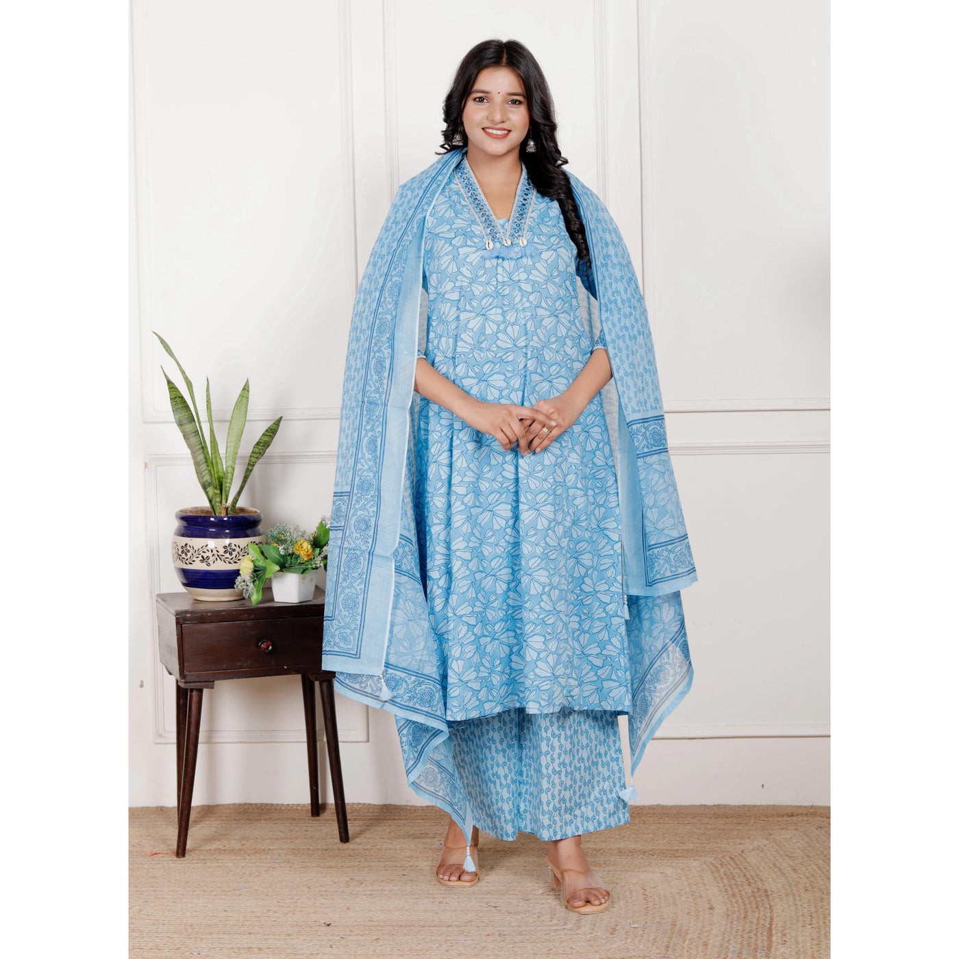 Cotton A-Line 3 piece set with plazo pant - M / Cyan-Blue