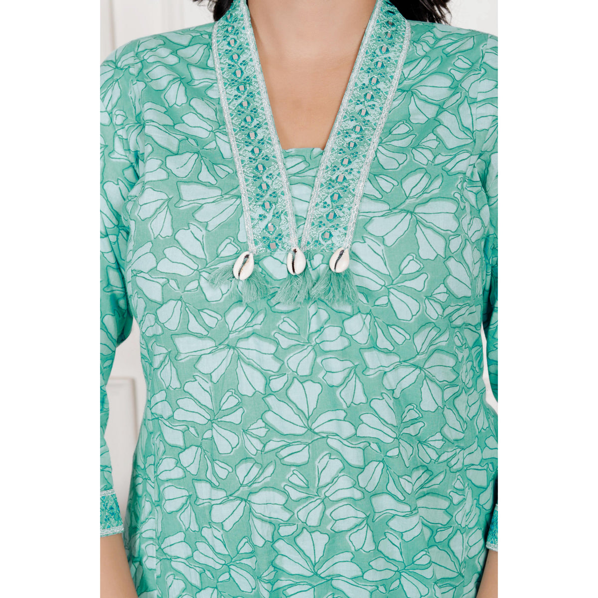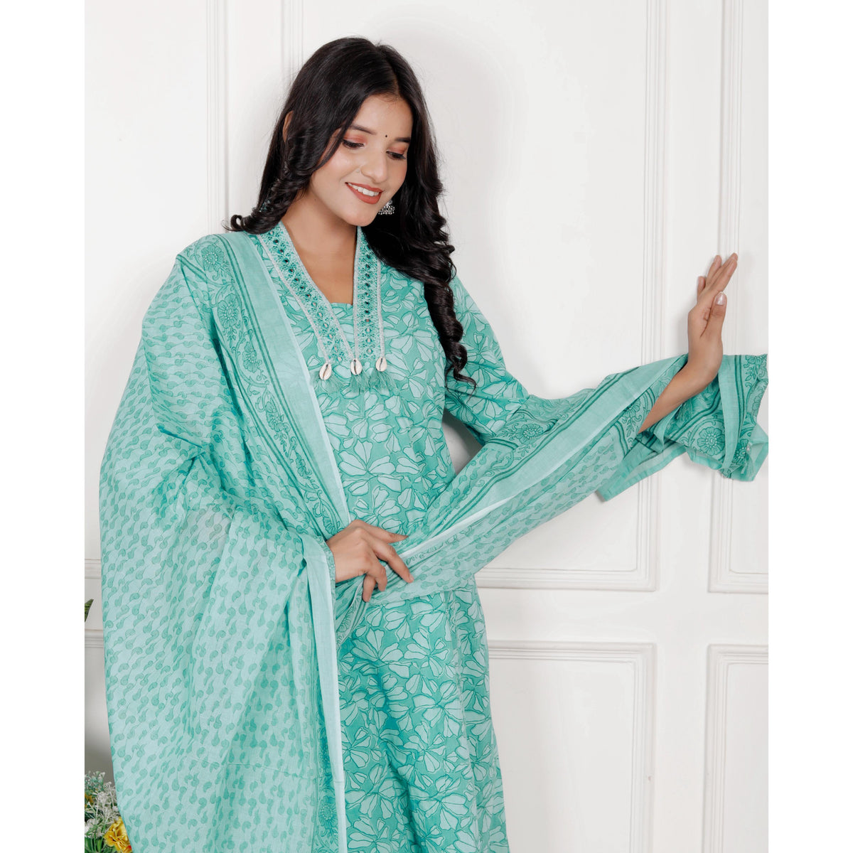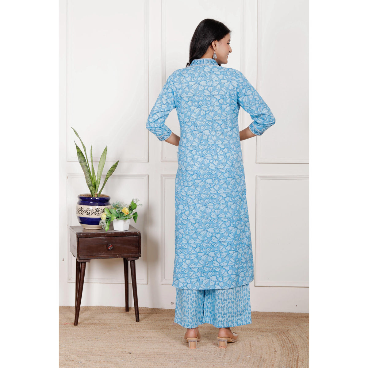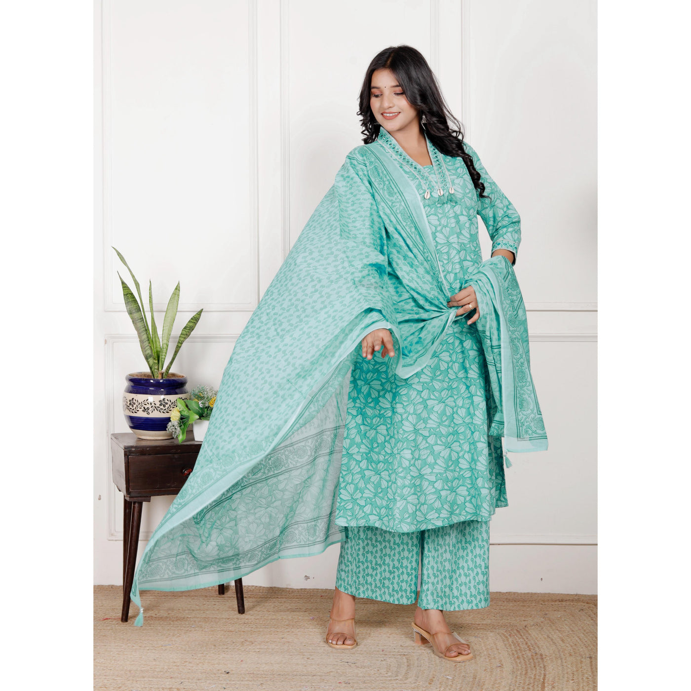 Cotton A-Line 3 piece set with plazo pant - M / Cyan-Blue