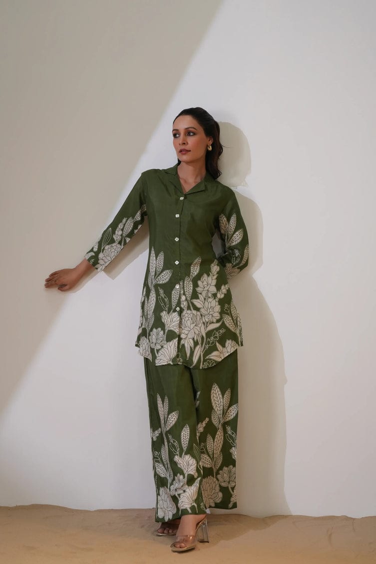 Olive Green and Royal Blue Floral Printed Co-Ord Set - M / Olive Green