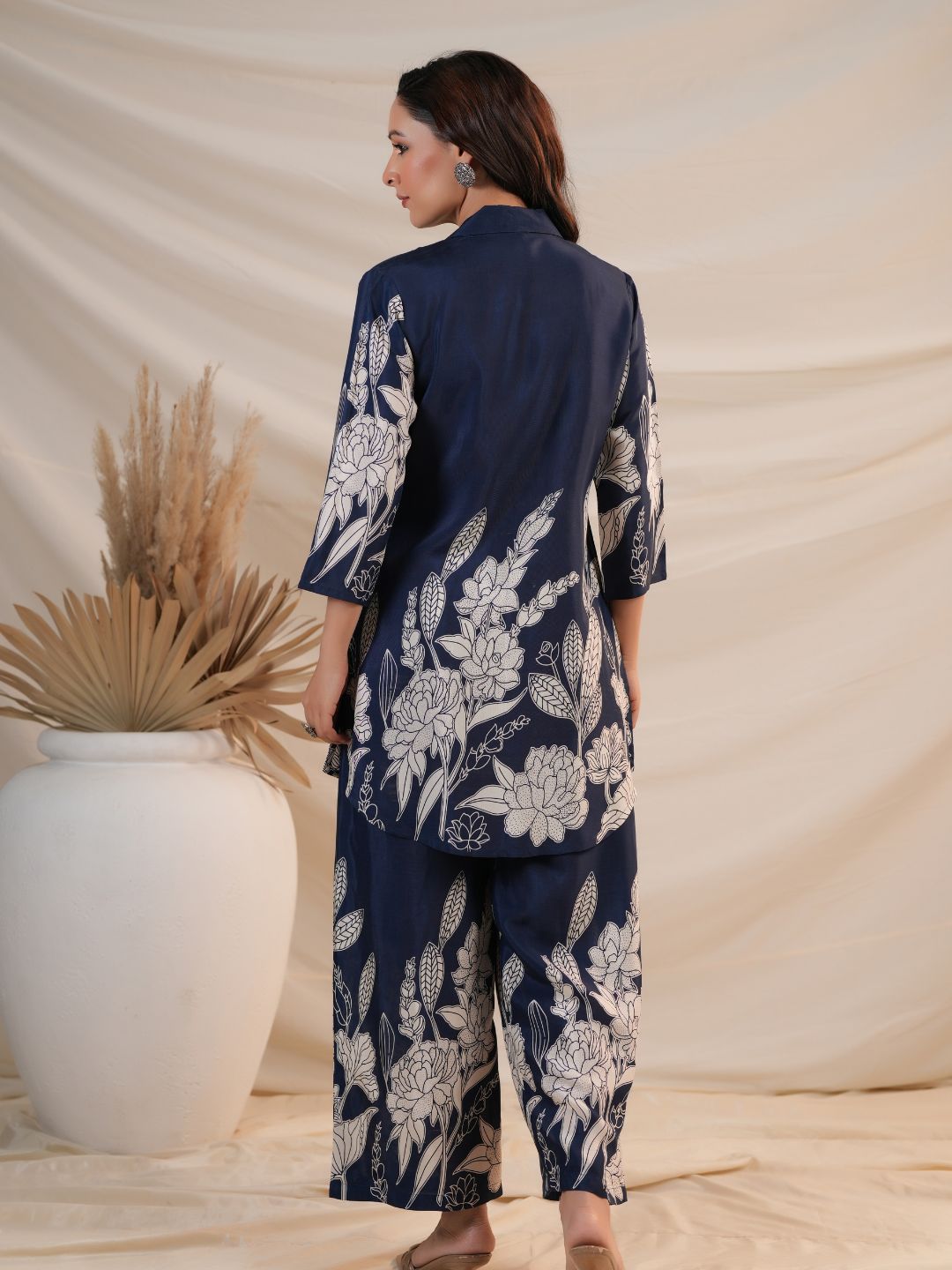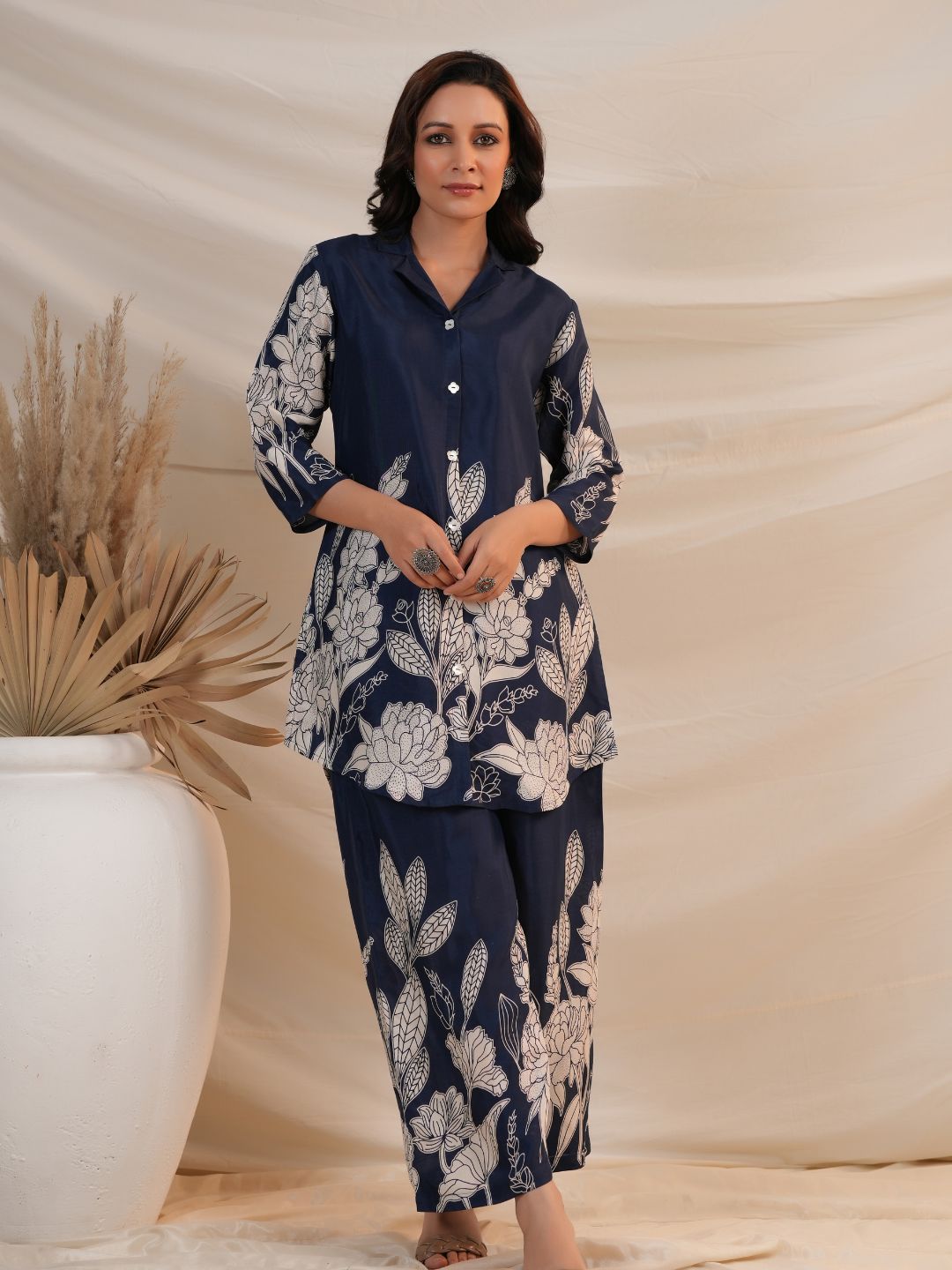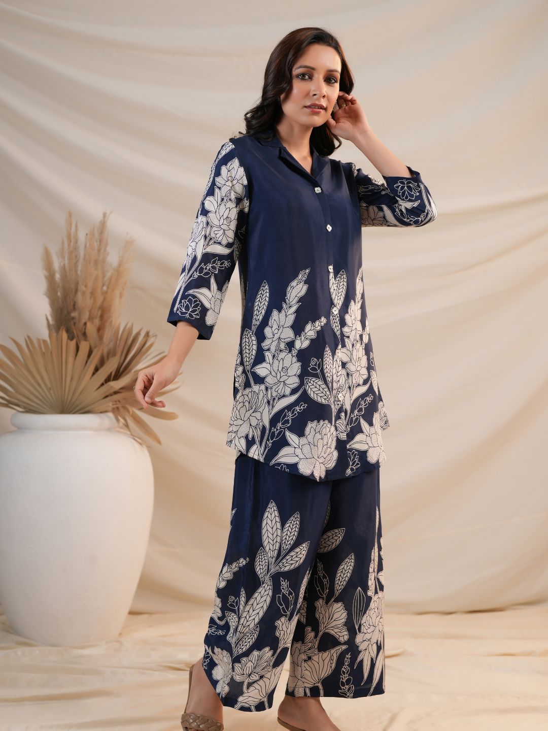 Olive Green and Royal Blue Floral Printed Co-Ord Set